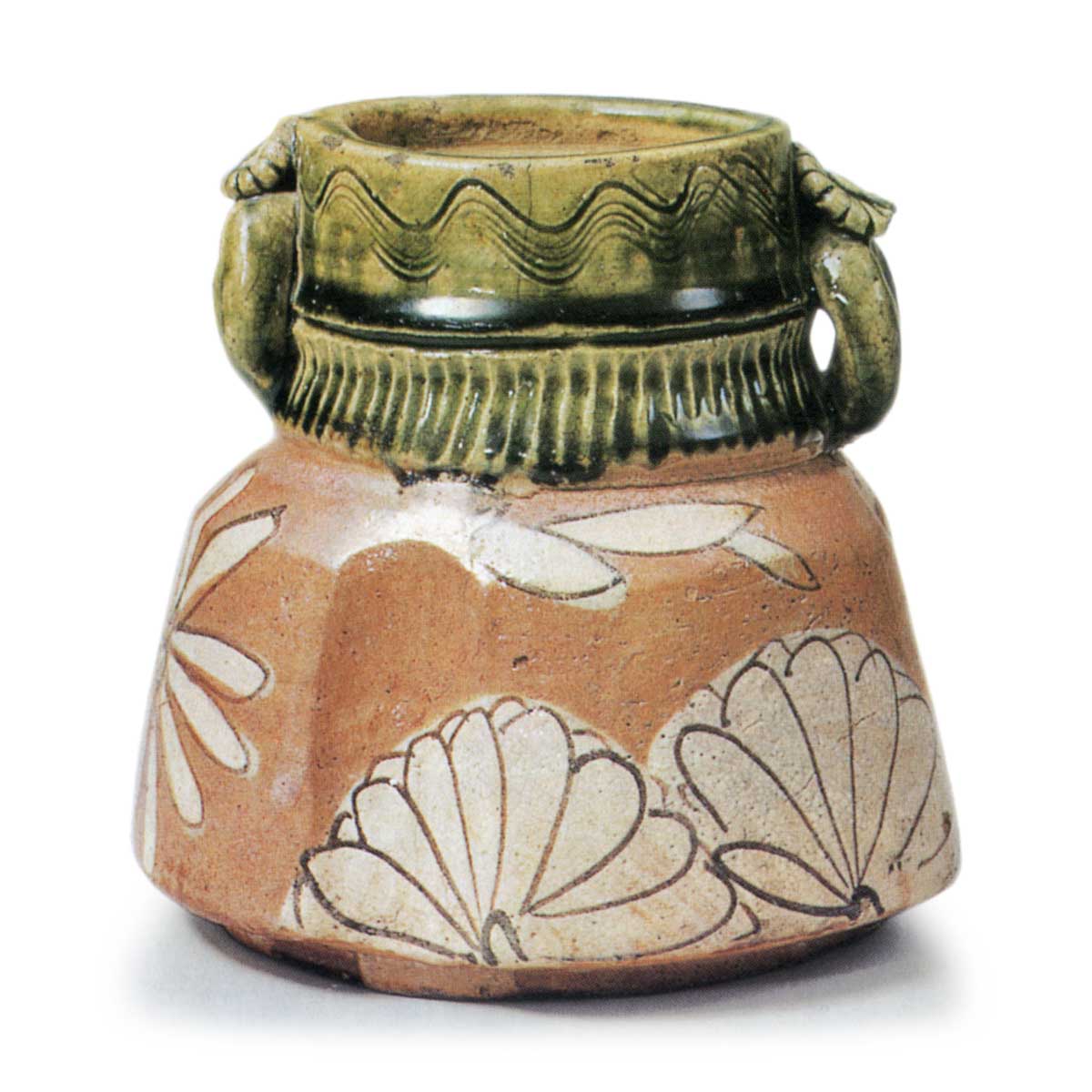 织部菊花纹水指 日本织部菊花纹水指 2025.07.272025.11.14 织部菊花纹水指 高度13.7厘米,口径8.3厘米这款水指造型独特,筒身下部呈扩散状,高台部分圆润削出,颈部两侧带有耳饰,其上部装饰有菊花形装饰。红色织部水指较为罕见,而这款作品在制作工艺上堪称精湛。以红色为底,以白色装饰并以锈绘技法粗略地表现出菊花纹样, 充分展现了庆长时期的艺术氛围。
