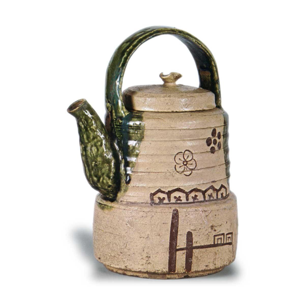 织部梅花纹水注 日本织部梅花纹水注 2025.07.28 织部梅花纹水注 高度27.5厘米,左右20.8厘米,底径14.4厘米MOA美术馆与织部桥纹水注器形相似,但此器带有盖。高台低矮,胴部以轆轤纹稍深刻七段,正面饰梅花与梅鉢、龟甲连风纹样,背面绘木瓜状纹样与网目纹样。釉色淡绿,整体烧制柔和。