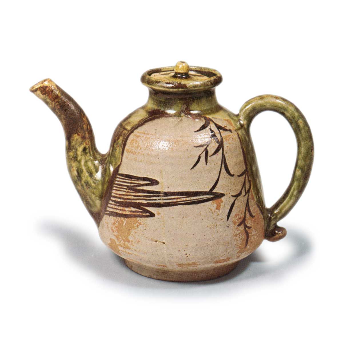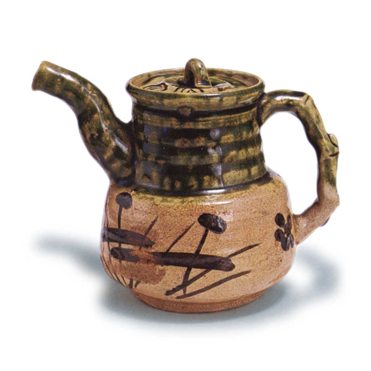织部柳纹汁注 日本织部柳纹汁注 2025.07.28 织部柳纹汁注 织部花汤纹汁注 这些都是俗称“汁注”的小型注器。此外还见过其他几种,但这款器物的造型尤为轻巧灵动。图130的一侧饰有霞与柳的图案,另一侧则以蔓草纹与七宝纹为装饰,图131的一侧绘有草花与梅鉢纹,背面则描绘了桧垣风格的纹样,盖子上还饰有涡纹。所有器物均采用大尺寸的高台,台部处理得自然流畅。