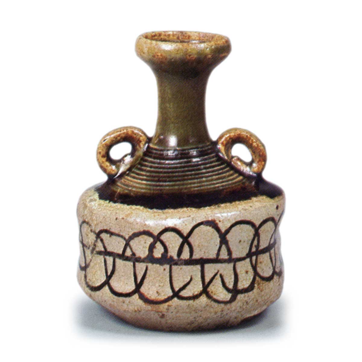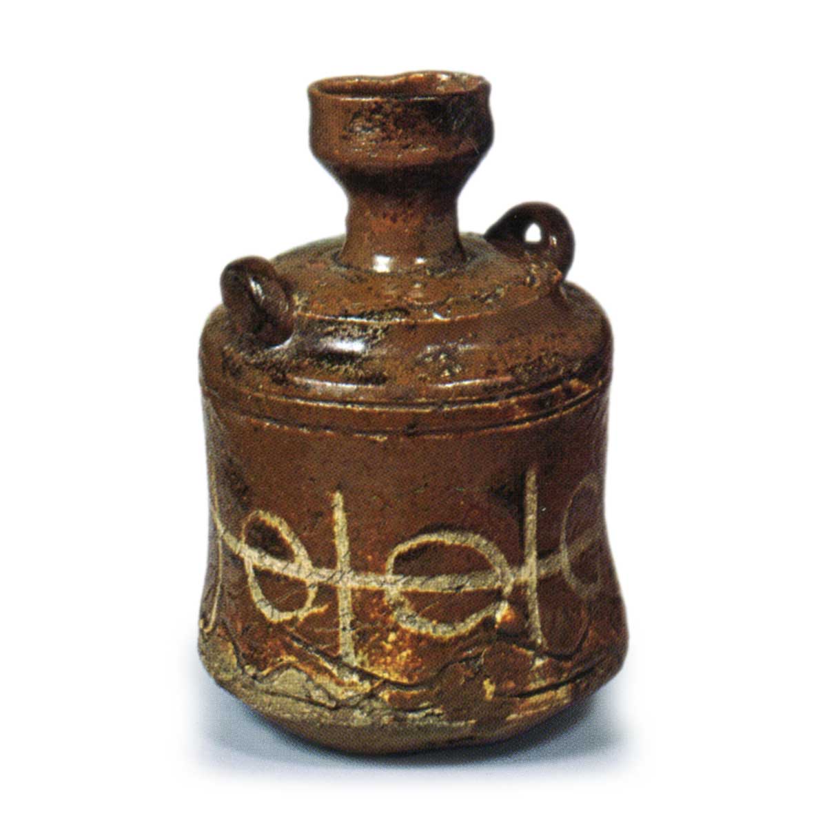 织部耳付振出 日本织部耳付振出 2025.07.28 织部耳付振出 织部耳付振出 织部耳付振出 高度9.7厘米 口径1.9×2.7厘米 胴径6.4厘米 底径3.3×4.0厘米梅泽纪念馆这些作品如今在茶人中被用作振出,但其原本是否为油量器皿尚不明确。 均具有织部风格的飘逸韵味, 图132背面饰有笼目纹, 正面绘有难以辨认的花鸟图案,颇具趣味。底部平坦,留有切线痕迹。图133在胴部环绕轮系纹,底部同样平坦并有切线处理。图134刮去釉面刻出线刻纹,裾部还施以波浪形节纹。烧成俗称“柿织部”的茶褐色釉面。