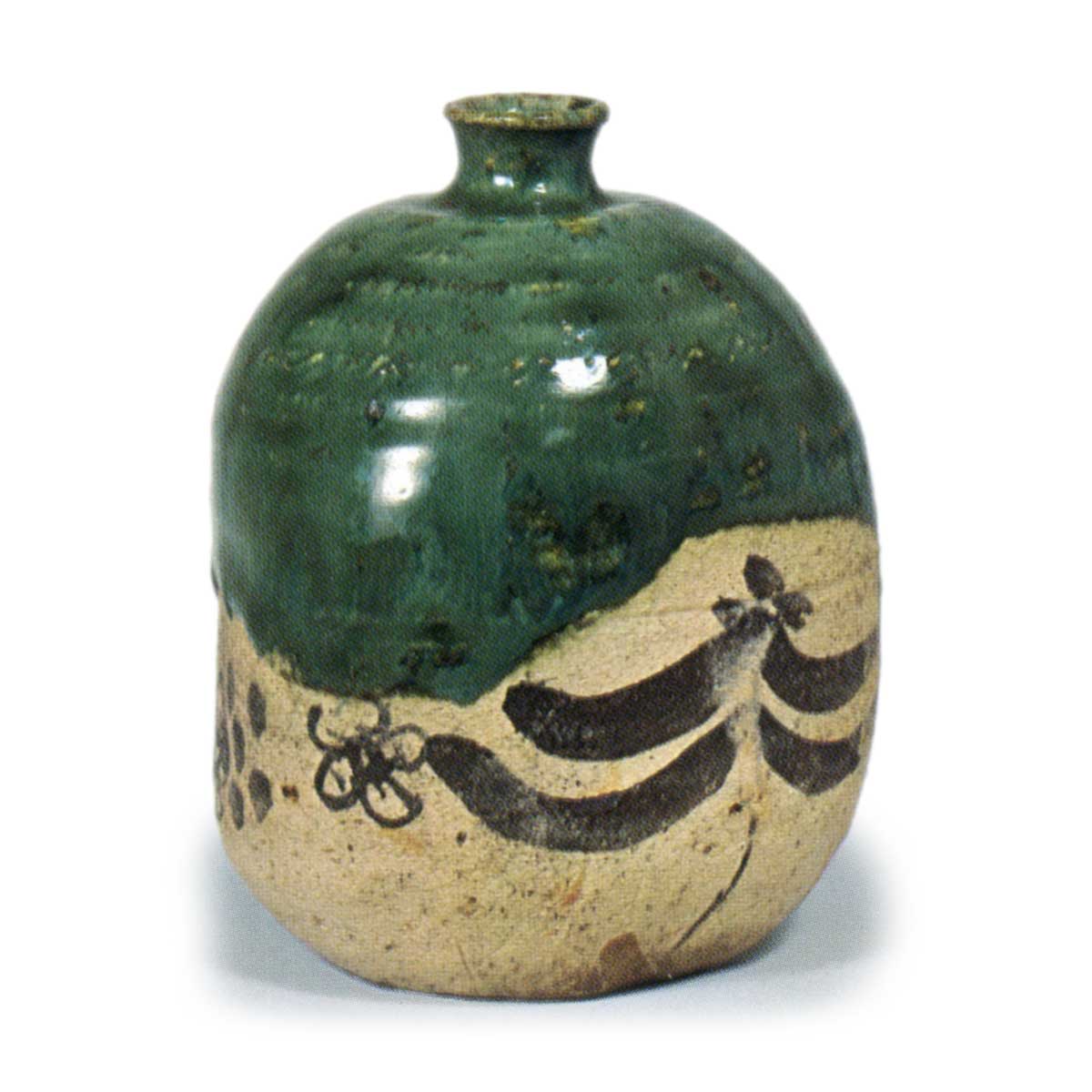 织部梅花纹振出 日本织部梅花纹振出 2025.07.28 织部梅花纹振出 高度9.7厘米 口径1.3厘米 胴径7.3厘米 底径4.3厘米梅泽纪念馆这款小巧的德利形酒壶,壶身圆润饱满,口部较小,因此也被用作振出壶。上部覆盖的绿色釉面呈现出海鼠皮般的质感,下半部则饰有梅花纹和幔幕般的纹样。底部采用线切工艺,底边也覆盖着长石釉。