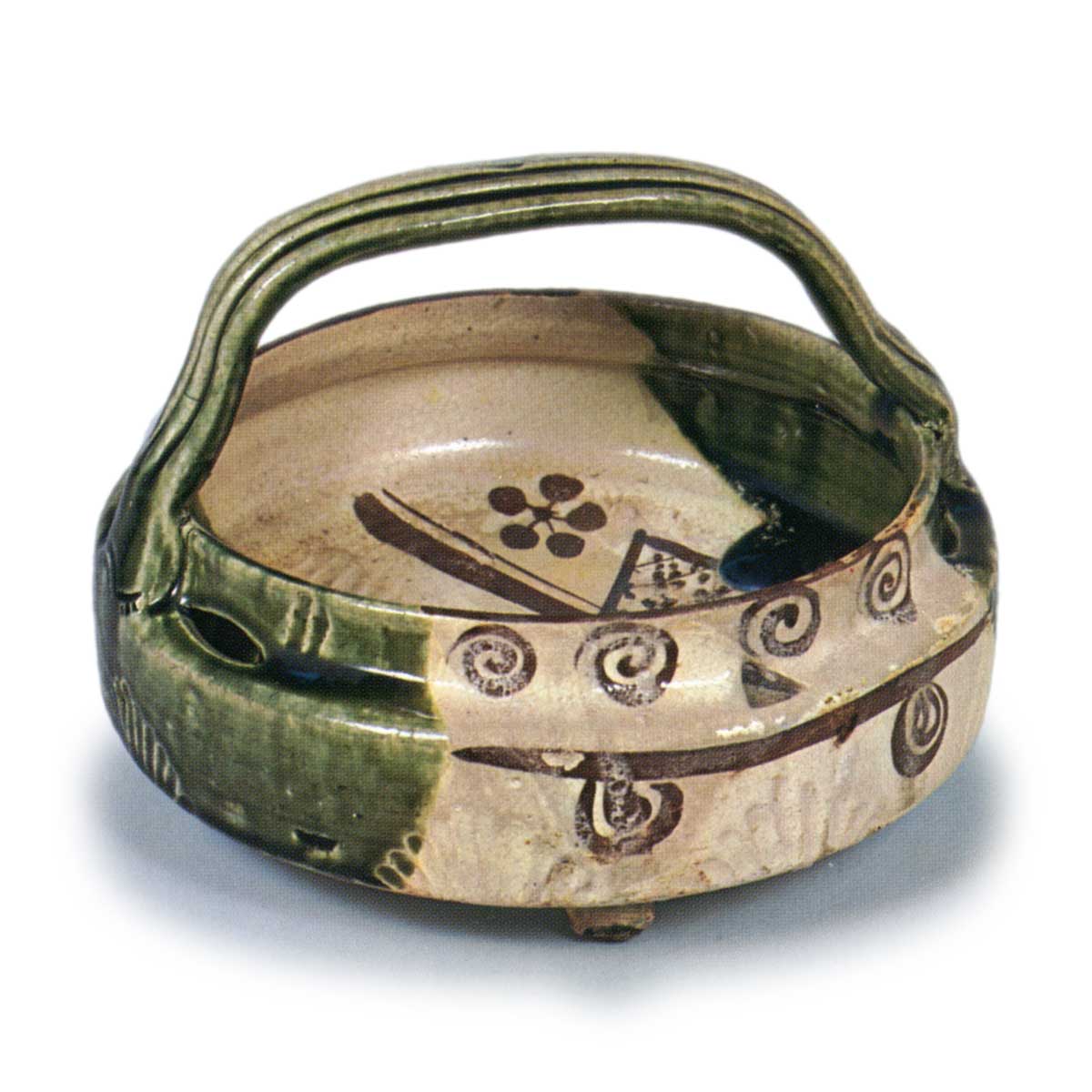 织部透纹手鉢 日本织部透纹手鉢 2025.07.28 织部透纹手鉢 高度15.5厘米,口径17.4×18.1厘米,三脚口部带有阶梯状的圆形鉢,侧面设有五个透纹。内壁饰有梅鉢、菱形纹、锯齿纹等图案,侧面配以涡纹。外侧边缘饰有菊花状雕纹,底部平坦,三足支撑,设计独特。