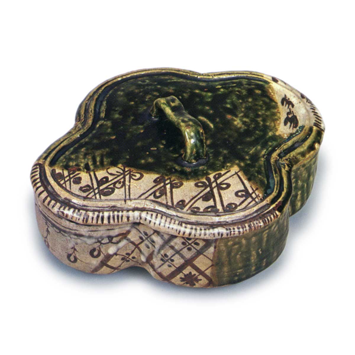 织部木瓜形盖物 日本织部木瓜形盖物 2025.07.28 织部木瓜形盖物 高度11.0厘米,口径21.5×25.0厘米这件木瓜形盖物堪称佳作,可惜未能亲手把玩,因此无法确认内壁的纹饰。绿釉烧制得浓郁,颇为赏心悦目。