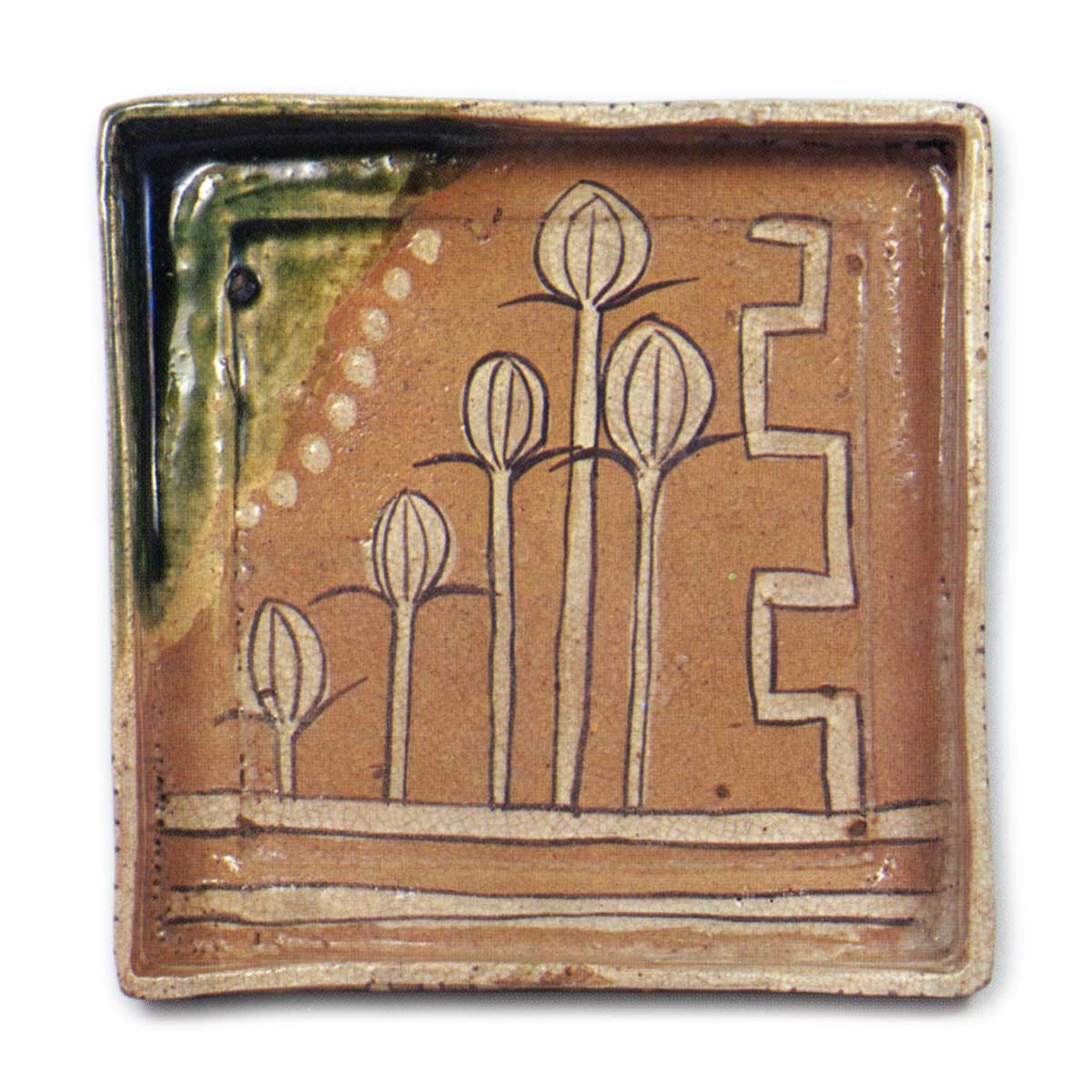 织部四方平鉢 日本织部四方平鉢 2025.07.28 织部四方平鉢 高度7.5厘米,口径19.6×19.7厘米在四方平鉢中,这是最鲜艳精美的作品,手鉢上也可见独特的花纹图案,描绘得十分洒脱。两侧的脚呈餐盘般的栅格状,略微抬高,这种形式的角鉢我也见过几件。