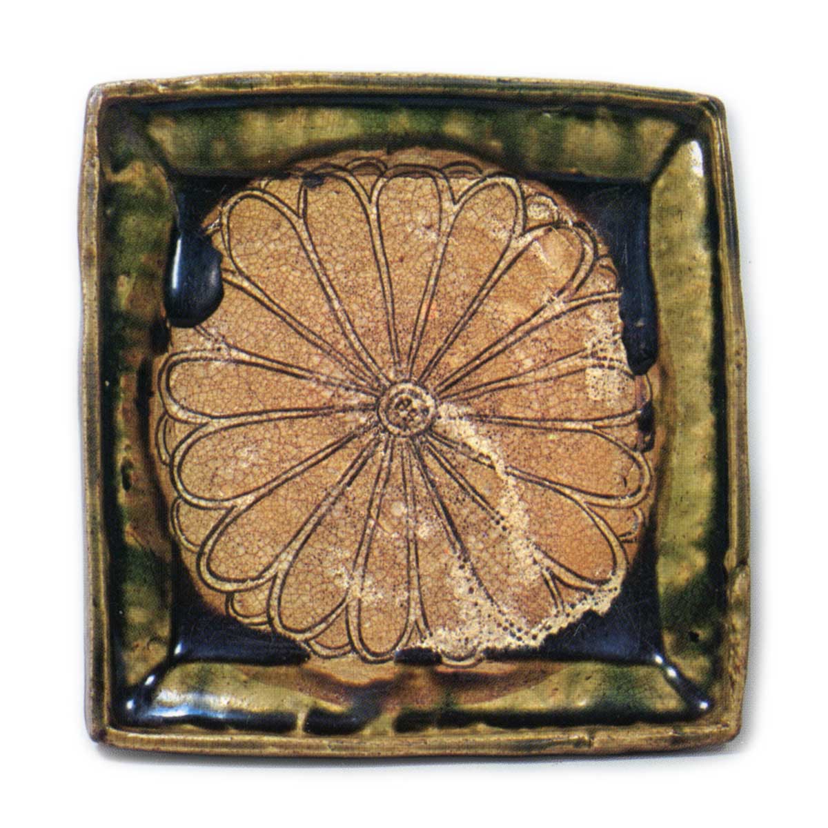 织部菊纹四方平鉢 日本织部菊纹四方平鉢 2025.07.28 织部菊纹四方平鉢 高度5.4厘米,口径20.5×20.8厘米,四脚该器物以十七瓣的大菊花为主要图案,手部处理精巧,被名古屋的收藏家珍藏。釉面略显粗糙,实为可惜。