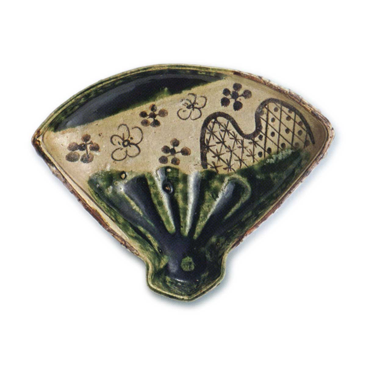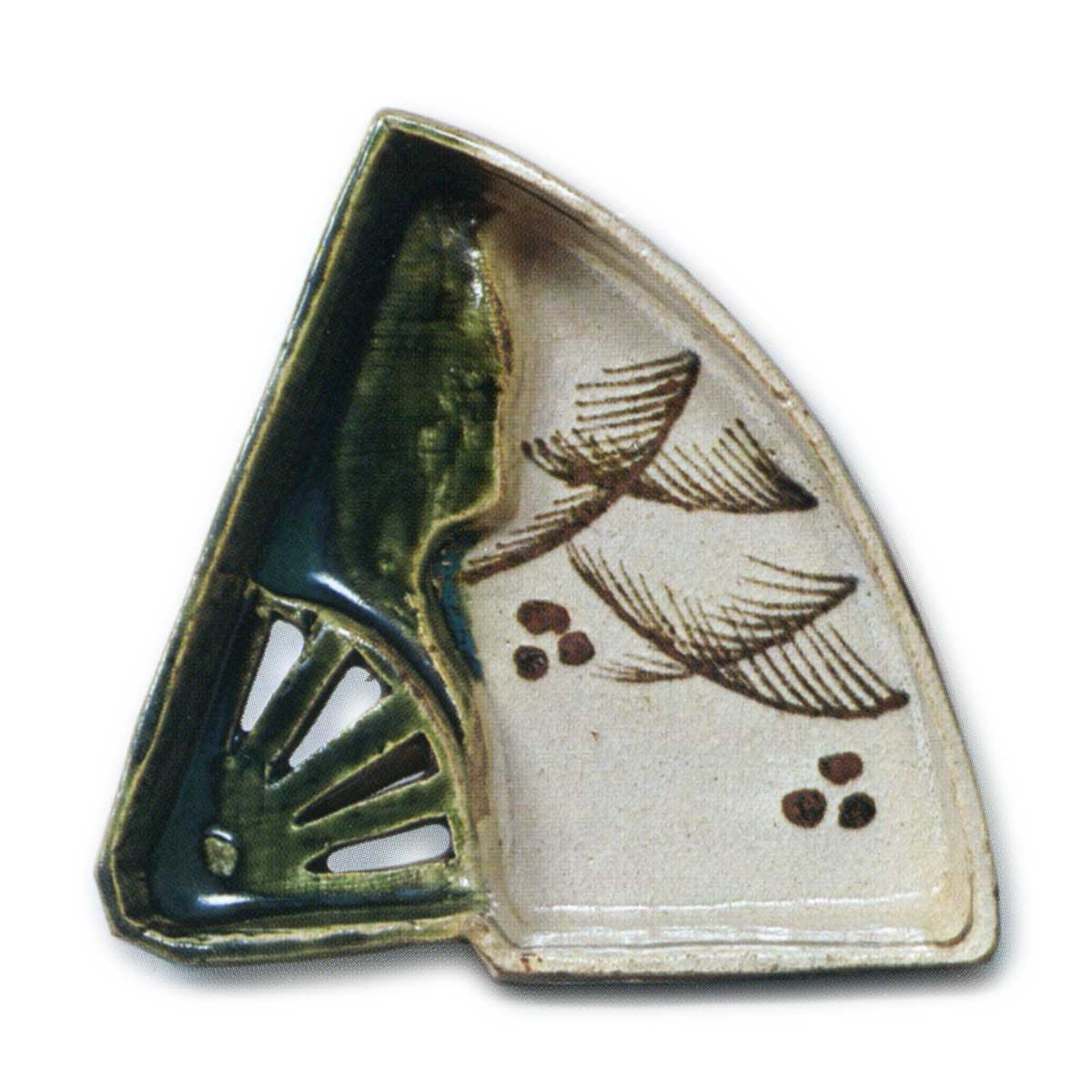 织部芒纹扇向付 日本织部梅花散纹扇向付 2025.07.29 织部梅花散纹扇向付 织部芒纹扇向付 高度5.4厘米,口径15.7厘米,三脚这些也是扇面附带的精品,均成五客一套。 织部梅花散文扇面附带的器形较为粗犷, 织部芒文扇面附带的器形稍显坚硬, 白釉光滑且融化良好。 这种烧制效果实属罕见。