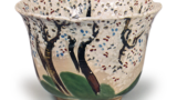 织部七宝连文四方入隅向付 日本织部七宝连文四方入隅向付 2025.07.29 织部七宝连文四方入隅向付 织部七宝连文四方入隅向付 高度4.8厘米,口径11.3×14.6厘米,三脚四方入隅的向付,虽然器形简单,但在向付中却很少见。器身凹凸有致,文样与绿釉均烧制得极为鲜艳,堪称精品。底部三面均有脚。