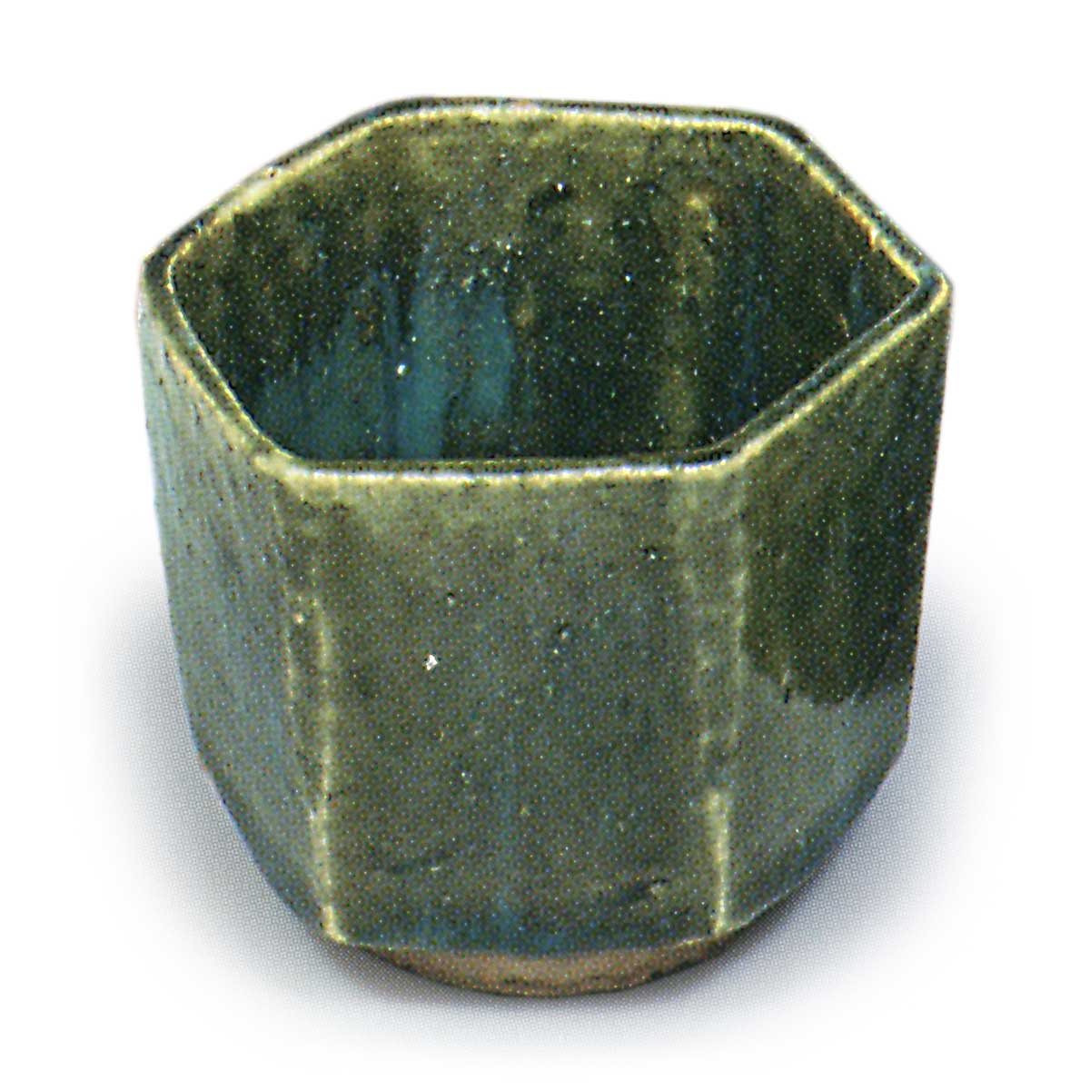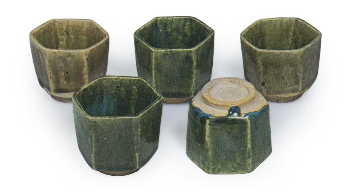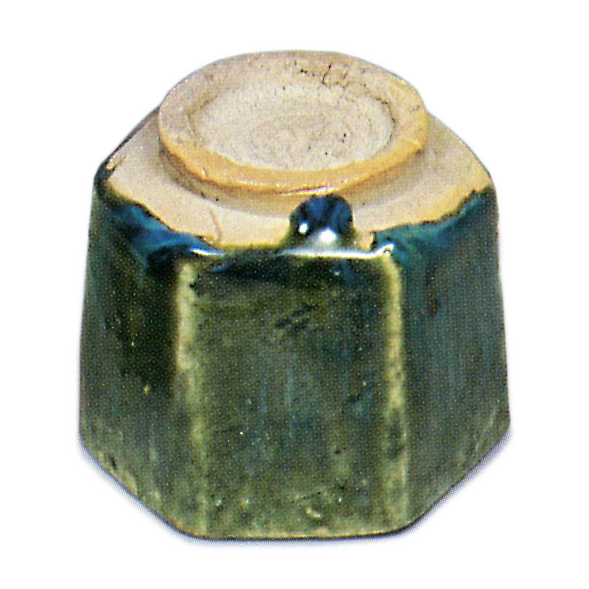 织部六角猪口 日本织部六角猪口 2025.07.29 织部六角猪口 织部六角猪口 高度5.5厘米,口径5.9厘米,高台径3.5厘米这种六角猪口常见于黄瀬戸和椿手瀬戸等风格,其中椿手风格的器形与之完全相同。除底部外,整个器身均覆盖厚厚的绿色釉料。如今多用于饮酒,因此五件成套的极为罕见。弥七田织部烧中,进入江户时代后的弥七田窑,其作风与元屋敷等织部烧有显著差异。其主要特色在于不分区域施绿釉,且釉面多呈黄褐色并滑润融化。然而,弥七田窑早期也曾烧制过元屋敷风格的作品。