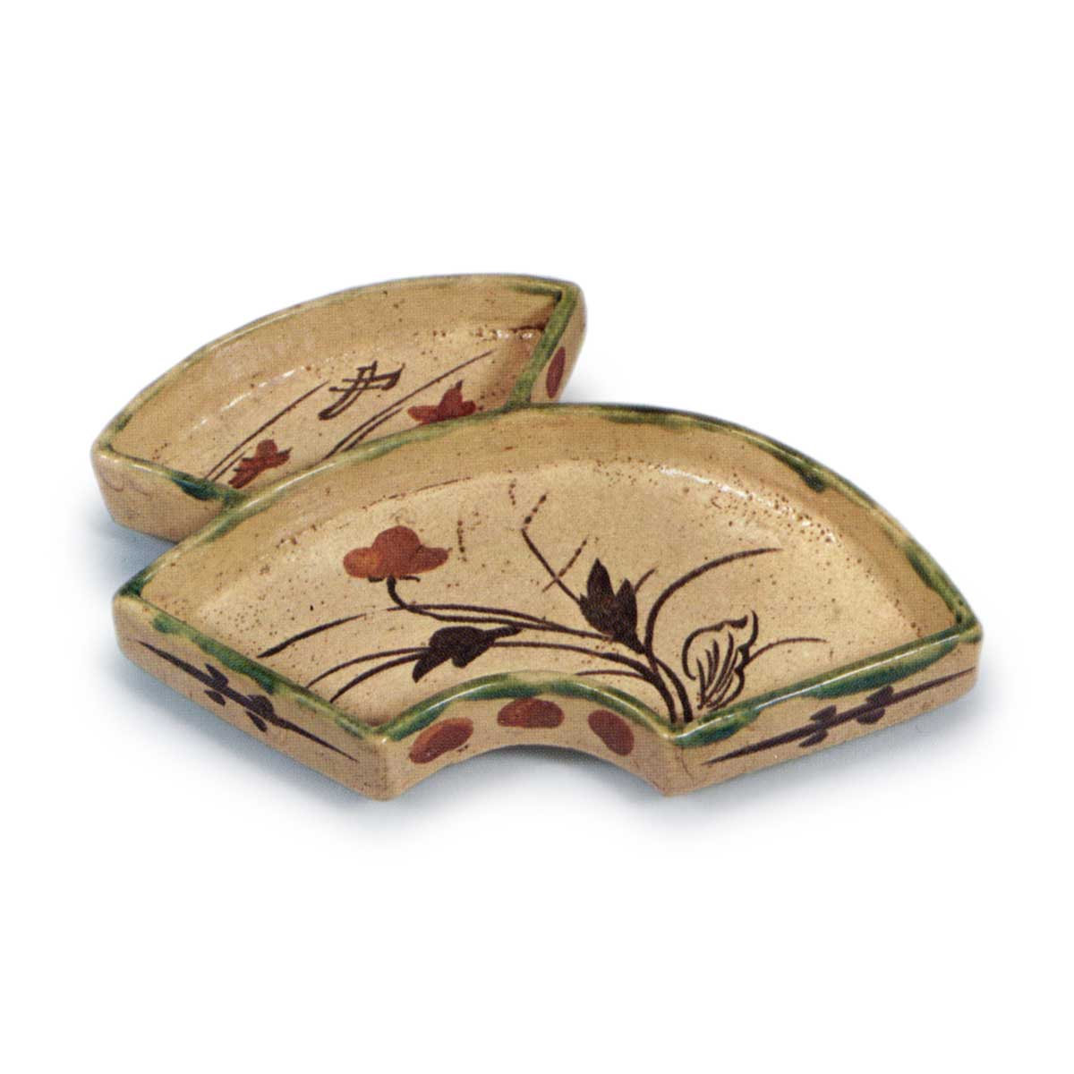 织部草花纹扇面盘 日本织部草花纹扇面盘 2025.07.29 织部草花纹扇面盘 高度3.4厘米,口径12.6×18.8厘米,三脚该盘形似将大小不一的扇面拼接而成,造型独特。盘面分别绘有草花与飞鸟纹样。盘底三面各附有脚,并留有三处明显的烧制痕迹。