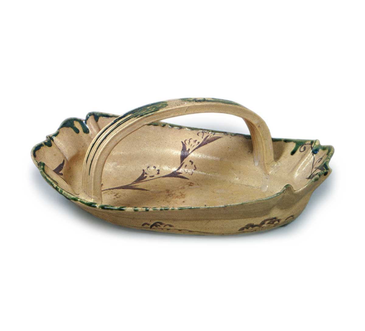 织部草文舟形手鉢 日本织部草文舟形手鉢 2025.07.29 织部草文舟形手鉢 高度12.2厘米,口径19.4×30.2厘米舟形的手鉢,制作手法与京都烧相似,优雅精致。内壁饰有两片草花,侧面饰有波纹图案。底部为圆底。