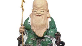 乐烧福禄寿摆件高30.0厘米 宽25.0厘米道八留下了许多此类具有雕塑感的福禄寿等像,其中这件是风格最为出色的作品。采用质地细腻柔软的胎土,表现了坐在岩石上的福禄寿,衣纹施以白釉和绿釉,岩石则施以紫釉。内侧刻有“土师仁阿弥造”、“福寿开运奉...