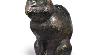 黑银彩猫形手培高29.6厘米 远山纪念馆这也是道八留下的雕塑风格作品中的杰作。这是一件以黑乐烧为材质、将黑猫形象艺术化的暖手瓶。在背部切出一部分作为瓶盖,全身施以黑釉,并在黑釉之上薄薄地涂上一层银彩,以此表现出猫毛的光泽感。瓶盖内侧虽有“仁...