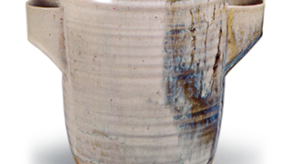 半身釉瓢形水指高15.4厘米 口径12.1厘米 底径8.2厘米滴翠美术馆仁阿弥道八于天保年间在京都嵯峨角仓玄宁的别邸开创了一方堂烧,此作即为一方堂烧的杰作。这亦是仿仁清风格的倒瓢形水指,很好地捕捉了原作的韵味。铁釉与白浊釉以片身替的方式交替...
