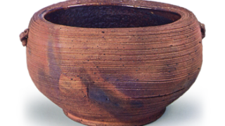 流釉水指高18.2厘米 口径14.0厘米 宽20.1厘米 底径8.1厘米这种造型的水指,仁清曾有原作(第十二卷《仁清 乾山》),仁阿弥则是仿制而成的。虽不及仁清原作那般轻妙,终究难掩仿作之感。高台处盖有仁阿弥的印章,原装盒盖正面题有“仁清模...