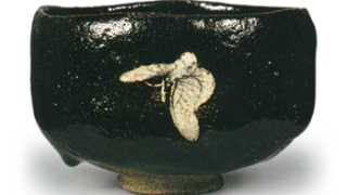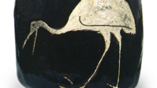 鹤纹黑茶碗高9.5厘米 口径9.7厘米 底径5.4厘米东京国立博物馆据传,此类以黑釉为底、白釉描绘鹤等图案的茶碗,是仿效乾山风格制作的。此为手捏茶碗,碗身一侧以白釉描绘立鹤纹样,整体则施以黑釉。粗犷风格的高台内饰有涡状兜巾纹,裸露陶土的高台...