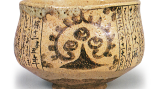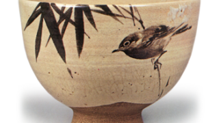 锈绘竹鹂图茶碗高9.1厘米 口径12.3厘米 底座直径4.9厘米滴翠美术馆原装盒盖内侧题有“仁清形茶器 仁阿弥印”字样,并盖有葫芦形印章;这确实是一款仿仁清风格、造型流畅的茶碗。这属于所谓的吴器形,高台向外展开,高台内侧被削得圆润深邃,中央...