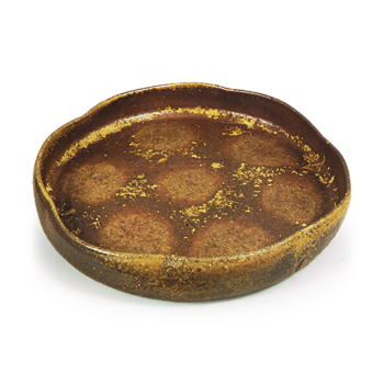 备前 备前平碗 备前平碗高5.6厘米 口径26.3×27.0厘米 三足此为规整的圆形轆轤拉坯平盘,整体胎体较薄。盘面平整,边缘呈铙钵状,盘面留有七处釉下透光孔。倾泻而下的胡麻釉色泽瑰丽。底面三处附有细小乳足,其上亦以... 2025.09.11 备前日本餐具