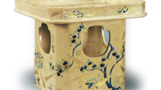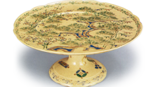 京都烧 彩绘松竹梅纹高坏 彩绘松竹梅纹高坏高15.3厘米京都国立博物馆此为口沿饰轮花的华美高坏,内壁精细描绘松竹梅纹样,脚部点缀七宝纹与宝尽纹。天板两侧穿有小孔,可用于系挂置于其上的供品。此类器型中,其制作工艺最为精巧细腻。 2026.03.08 京都烧日本餐具