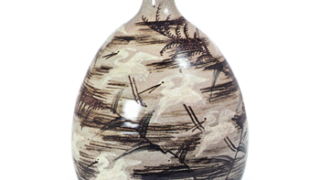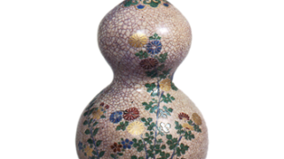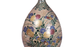 京都烧 色绘秋草纹酒壶 色绘秋草纹酒壶高24.1厘米 口径3.8厘米 胴径14.8厘米 底径9.5厘米此酒壶虽属备前烧等器型中常见的辣形,但其口部至胴裾处仍厚施着呈现朽叶色调、带有粗粝开片纹的釉料,其上以彩绘与金彩描绘以菊花为主体的秋草纹样。作风与前图作品近似,但... 2026.03.09 京都烧容器日本