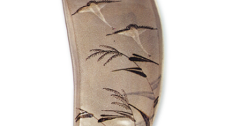 京都烧 锈绘芦鹭纹酒壶 锈绘芦鹭纹酒壶高22.3厘米 口径3.8厘米 胴径15.5厘米 底径10.3厘米东京国立博物馆壶身浑圆丰满,壶口宽大,此类造型在京都烧陶器中极为罕见。采用与乾山相似的技法,以锈彩与白泥在釉下描绘芦苇与白鹭纹样,除底座外全面施釉,釉面呈现开片... 2026.03.08 京都烧容器日本