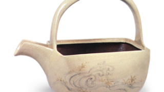 京都烧 銹絵染付龙田川纹酒壶 銹絵染付龙田川纹酒壶高17.8厘米 长径20.5厘米 底径9.3厘米 三足东京国立博物馆此酒壶仿燗酒壶造型,壶口呈四方形,壶底呈圆弧状,配有弓形壶柄。内壁全面施铁釉,器身两侧浅绘流水间飘落红叶的龙田川纹样,外层厚施泛黄的开片釉,釉色熠熠生辉... 2026.03.08 京都烧容器日本