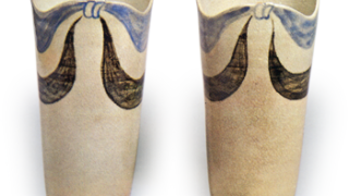 京都烧 锈彩染付帷幕纹筒形小碗 锈彩染付帷幕纹筒形小碗高12.8厘米 口径6.9厘米 底径4.5厘米京都国立博物馆此为造型独特的筒形小碗,器身以锈彩与染付技法描绘帷幕纹样。虽无铭记,推测此作亦属御室烧作品。 2026.03.09 京都烧日本餐具