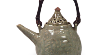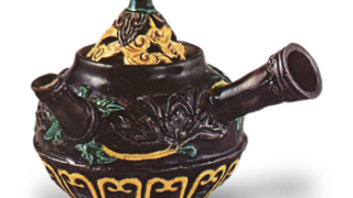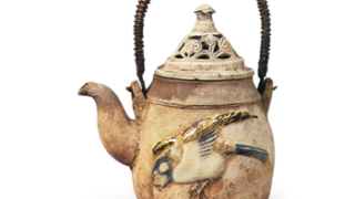 京都烧 彩绘贴花鸟纹水壶 彩绘贴花鸟纹水壶高14.1厘米 口径5.6厘米 底径5.7厘米这是一款模制白泥水壶,壶身两侧贴有鸟与牡丹的浮雕纹样,仅在贴花之上以青花和锈彩绘制纹样,并施以透明釉。这种风格虽被视为木米独创的代表作之一,但存世作品极为稀少。附带的盖子上雕有灵... 2026.03.14 京都烧容器日本