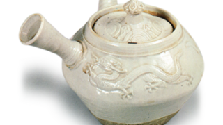 京都烧 白瓷龙纹急须 白瓷龙纹急须高8.4厘米 口径5.3厘米 底径4.6厘米这恐怕是木米白瓷急须中工艺最为精湛的一件。壶身肩部两侧饰有四爪龙的浮雕纹样,其间点缀着宝珠。除壶身下缘至底部的区域外,其余均施以白釉,釉面流淌平滑。壶盖内侧与壶柄背面均盖有“木米”印章... 2026.03.14 京都烧容器日本