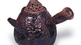 京都烧 交趾仿唐草纹急须 交趾仿唐草纹急须高10.8厘米 口径4.5厘米 底径4.4厘米这是木米紫交趾急须的代表作,两件器物似乎都是用同一模具制作的。不过釉色的搭配略有不同。壶身环绕着牡丹浮雕纹样,壶盖则透出云纹。把手下方有“木米”印记,盖底为素土,底部也盖有“木米... 2026.03.14 京都烧容器日本