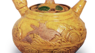 京都烧 交趾写荒磯文急须 交趾写荒磯文急须高9.4厘米 口径13.1厘米 底径9.2厘米东京国立博物馆壶身一侧饰荒磯纹,另一侧饰日轮与云纹,均为浮雕纹样。荒磯纹中的鲤鱼未施釉,保留素坯肌理,壶身自裙部至底缘外侧全面施以黄釉。以荒磯文装饰的急须本就罕见,而通体施黄釉的... 2026.03.13 京都烧容器日本