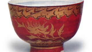 京都烧 赤绘金襴手牡丹纹煎茶碗 赤绘金襴手牡丹纹煎茶碗高4.8厘米 口径6.2厘米 底径2.8厘米木米虽也烧制赤绘金襴手,但其绝大多数并非如明代古赤绘金襴手般在赤绘上烧附金箔,而是以赤地为底,以金泥勾勒纹样。此款煎茶碗附原装盒,盒盖题有“茶钟五层 木米制印”,乃木米金襴手... 2026.03.13 京都烧容器日本
