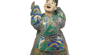 京都烧 彩绘三番叟香炉 彩绘三番叟香炉高27厘米 宽16.2厘米此香炉刻画滑稽的三番叟舞者形象,头部与扇子可拆卸,口部为烟道。松、竹、鹤等纹样及龟甲地纹的衣饰上彩釉层颇为厚重。底足露土,面部未施釉,仅眉眼唇等部位着色。 2026.03.12 京都烧日本香炉