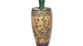 京都烧 色绘梅花纹伞形花器 色绘梅花纹伞形花器长径31.5厘米 胴径8.8厘米滴翠美术馆此悬挂式花器以竹柄伞为设计原型,其奇特造型极具京都烧特色。伞骨以精细线雕技法呈现,梅枝间点缀飞鸟的纹样描绘得细腻精巧。器底杓部有略显潦草的“□介”印章。据前文所述,此悬挂花器年代亦... 2026.03.12 京都烧日本花生