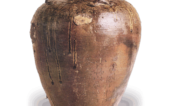 信楽備前丹波 備前四耳壺 備前四耳壺文明十二年(1480)銘高度40.5厘米 口径14.4厘米 胴径34.4厘米 底径18.5厘米口颈部略微外张,这是由于高温烧制导致开裂并扩散所致。此时期的口颈部通常直立,玉缘退化并趋于扁平。... 2025.06.12 信楽備前丹波日本罐