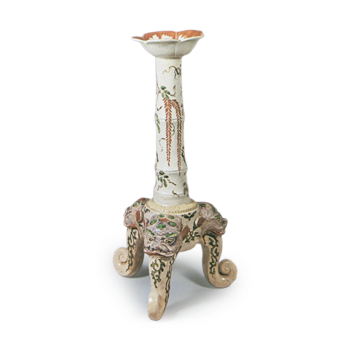 摆件 彩绘花纹烛台 彩绘花纹烛台高33.0厘米 三足田中丸收藏此烛台以狮颚为三足基座,细长筒身仿竹节造型,顶端饰有花形托盘。五瓣托盘以赤色勾勒花瓣,烛杆上环绕藤花纹样。乳白釉胎烧制略显生涩,鬼面紫与绿釉的彩绘色泽均显黯淡... 2025.09.26 摆件日本柿右卫门