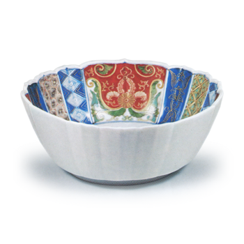 日本 彩绘花纹小碗 彩绘花纹小碗高7.4厘米 口径18.5厘米 高台径10.4厘米碗身呈轮花形,内壁三面饰唐花纹,各花纹间以三区隔开,间以龟甲纹、菱骨纹等纹样。此乃典型的古伊万里风格器物,其底内以赤色上彩绘有与元禄柿铭相... 2025.09.26 日本柿右卫门餐具