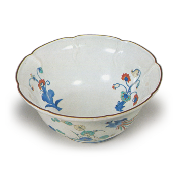 日本 色绘碗 彩绘牡丹纹碗彩绘铁线莲芥子纹花盆均为口部呈三十三瓣轮花形的所谓菊碗。此器形亦属柿右卫门样式的代表作之一,器身圆润饱满。从其作风推测应属元禄初期以前之作,或可与贞享元年(1684)荷兰商馆长订购的纯白轮... 2025.09.26 日本柿右卫门餐具