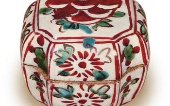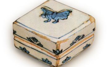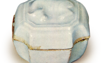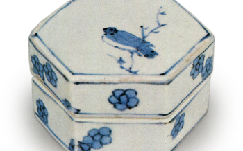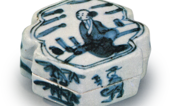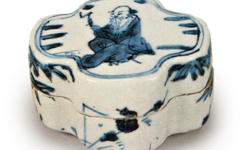 中国 吴须 周茂叔 吴须 周茂叔尺寸高4厘米口径5.0厘米胴径5.5―6.0厘米此香合应为日本定制之作,器形为四方入角,盖面绘有宋代学者周茂叔所绘爱莲图。倚靠栏杆者即周茂叔,池面点缀的斑驳纹饰被称为荷叶。据传,日本茶人初... 2026.01.03 中国香合