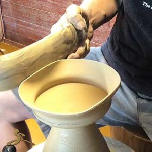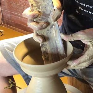 最後に口縁部を変形させ変形向付けを仕上げます。桃山茶陶の志野や織部、唐津や古染付などこの様な変形向付けが流行っていました。共通して言えるのは見込み内を鏡にして段差を付けて広縁を立ち上げ変形させて向付けにしています。