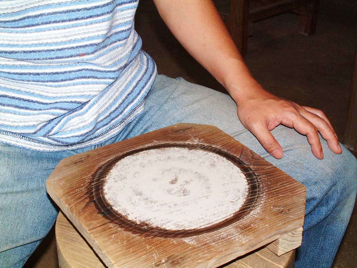・ロクロの天板もしくはガメ板(ロクロの天板に乗せる板)の上に満遍なく土灰を振り掛けます。