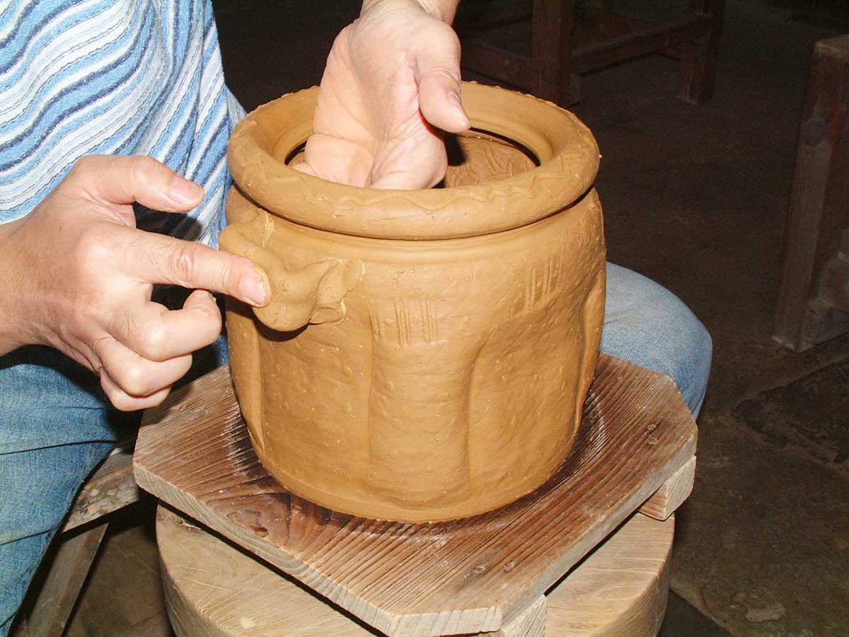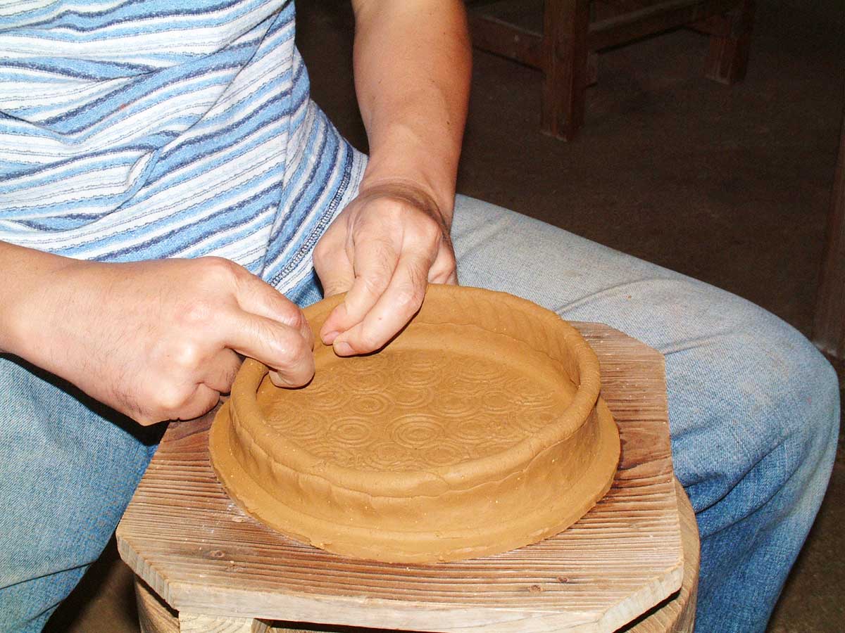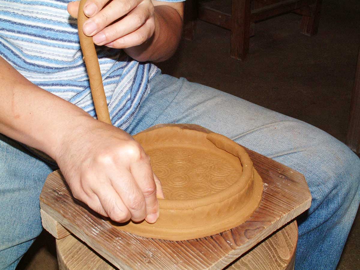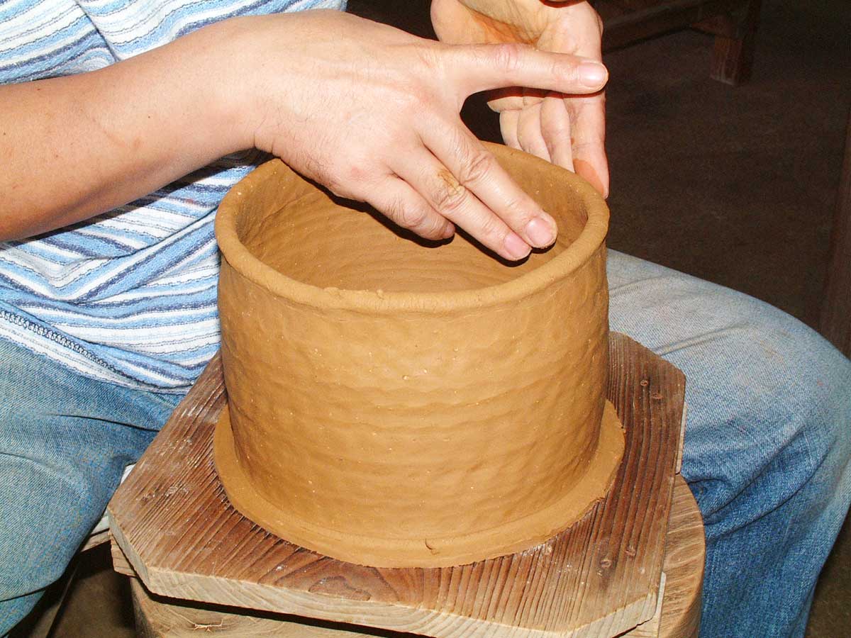 ・両手で積み上げた土を摘まみ延ばすようにしますが、均一な厚みと締まり具合で叩き特有の軽さが生まれます。