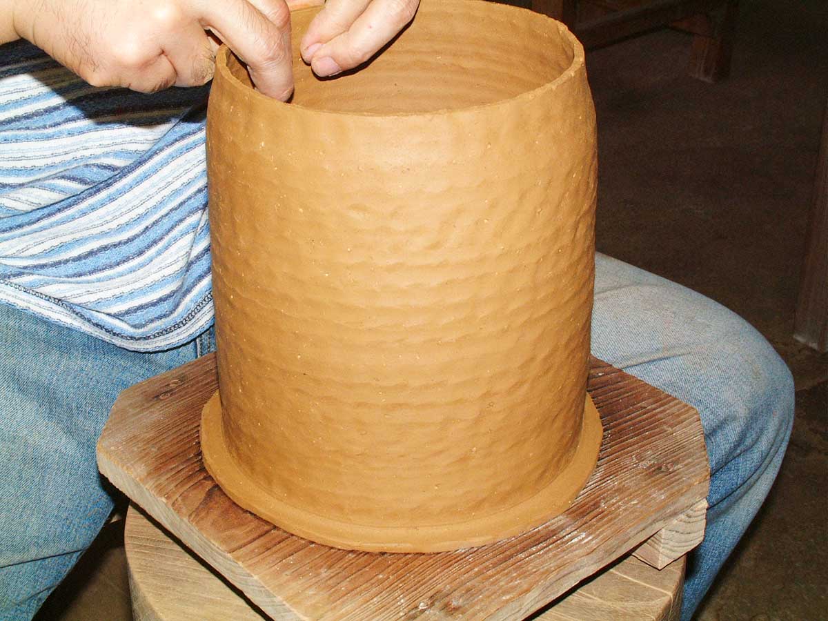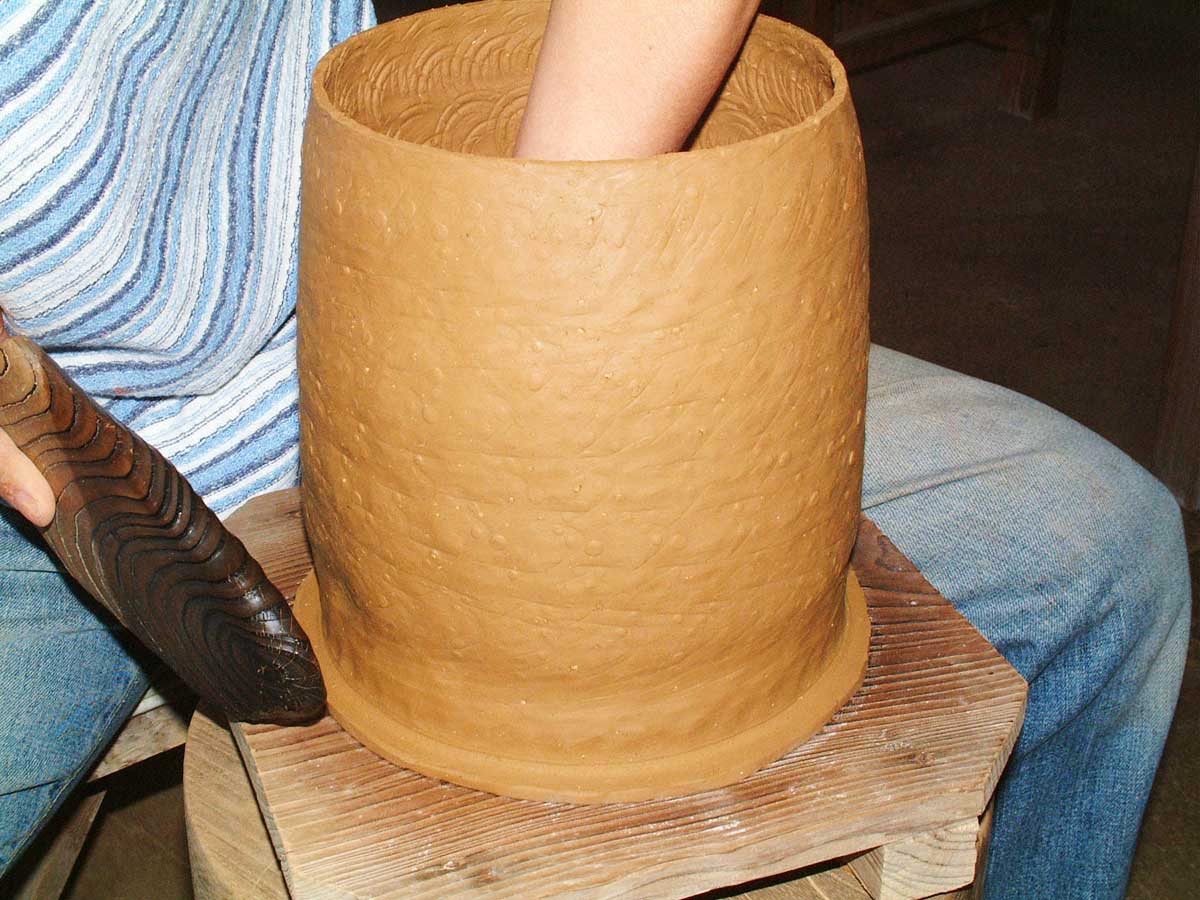 ・上から下まで休みを入れずに一気に叩くのがコツですが、最上部の口周りが叩くことで真円の形が極端に崩れるようであれば、前の説明での乾き具合が足らないのでもう少し乾燥させ堅くします。