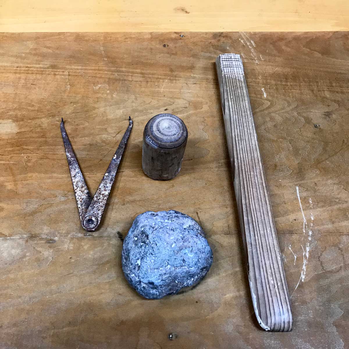 後の説明にもありますが器物を造る際、外側にシュレイ、内側にトキヤーを両手で持って土を挟み込むように叩きます。
