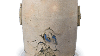 その釉景もなかなか多彩で、総体に青茶釉の中に渋紙色をまじえ、肩のあたりに黒釉がむらむらとかかっていて、さらに肩先から白青釉が一条流れ下がって裾にまで及び、釉際に至って止まり見事な置形をなしています。