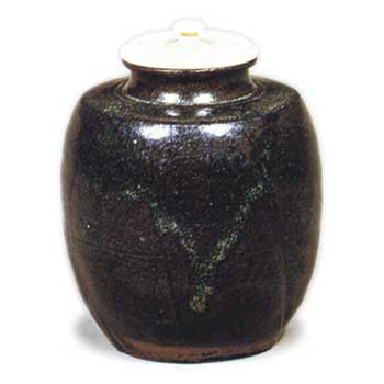 総体に栗色に紫色を帯び、肩先から幅広く共釉のなだれが二条下がり、一つは裾で止まって釉溜りが青みを呈し、一つは畳付まで下がり、釉溜りが青瑠璃色を呈しています。