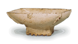 外面は横筋模様が五段をなし、藍鼠地釉の上に白釉で模様を現しています。