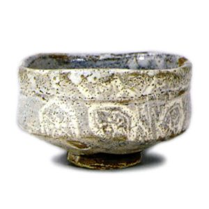 「峰紅葉」と似た作振りの茶碗だが、釉下の鬼板化粧が薄かったためか、鼠色の釉膚はやや薄い。また、鬼板化粧を全体にほどこしていますので、釉のかからない高台回りも赤黒い膚を見せています。胴と見込に大まかな檜垣文と亀甲文があらわされ、胴筋風の箟彫りと腰にも山路風の彫りがめぐらされています。外に開いた高台は力強く削り出され、高台内に井桁の窯印が箟彫りされています。また高台脇には指跡が五つくっきりと残っています。大萱の窯下窯の作と推測されています。