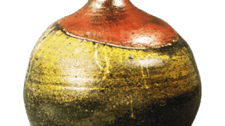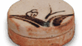 形式はまったく同じで、蓋表中央に十三弁の菊花文がくっきりと描かれました気品の高い作振りであり、身の立ち上がりを除いた全面にかかった白釉は「万年青香合」よりも厚く、雪のように白い膚はやわらかみをたたえ、赤い焦げがひときわ鮮やかであります。「万年青香合」とともに大萱牟田洞窯または窯下窯の作とされています。