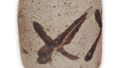やや裾の張った矢筈口の水指で、胴裾に二段の彫りをめぐらし、胴の中央にも縦横に箟目をつけています。平らな底は中央が少し持ち上がり、輪糸切になっています。胴には二株の芦の絵と大きな木をあしらった三連の山並が前と後に描かれ、両脇に矢先状の文様をあしらっています。筆行きはのびのびといかにも自由に描かれ、外側から内側上部にかけてずっぽりとかかった志野釉は、まことによく溶けて滑らかであり、釉がかりの薄い部分には火色が生じています。内面下半部と底には土膚があらわれています。