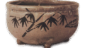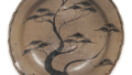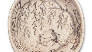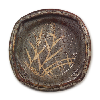 折りかえした口の四方を摘んで撫四方にした向付で、前図と異なって一段深い見込は広く作られ、平らな底の三方に脚が付き、脚の間にまるい目跡が残っています。見込には芦と橋の文様を白抜きであらわし、鬼板化粧がけの上にかかった白釉はかなり厚く、しかもやわらかく焼き上がって美しいです鼠色を呈し、口縁や底など釉がかりの薄いところには暗褐色の赤い焦げが生じています。見込にも小さな目跡が三つ残り、中央に小さく渦状の轆轤目があらわれています。これも鼠志野向付としては出色の作品であります。